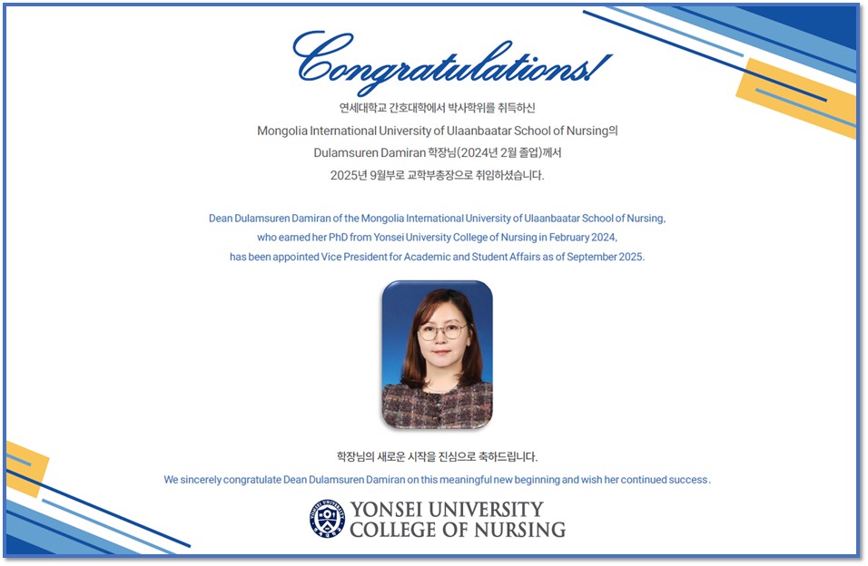 News [Spotlight] Appointment of Dean Dulamsuren Damiran as Vice President for Academic and Student Affairs 관리자 2025-09-12 조회수 593 공유하기 공유하기 페이스북 네이버블로그 카카오톡 카카오스토리 닫기 목록 이전글연세대학교 간호대학생, '유일한 아카데미' 수상 다음글연세대 간호대학 석사과정생 3명, 홍콩중문대 PhD Summer Workshop 추천 및 참여