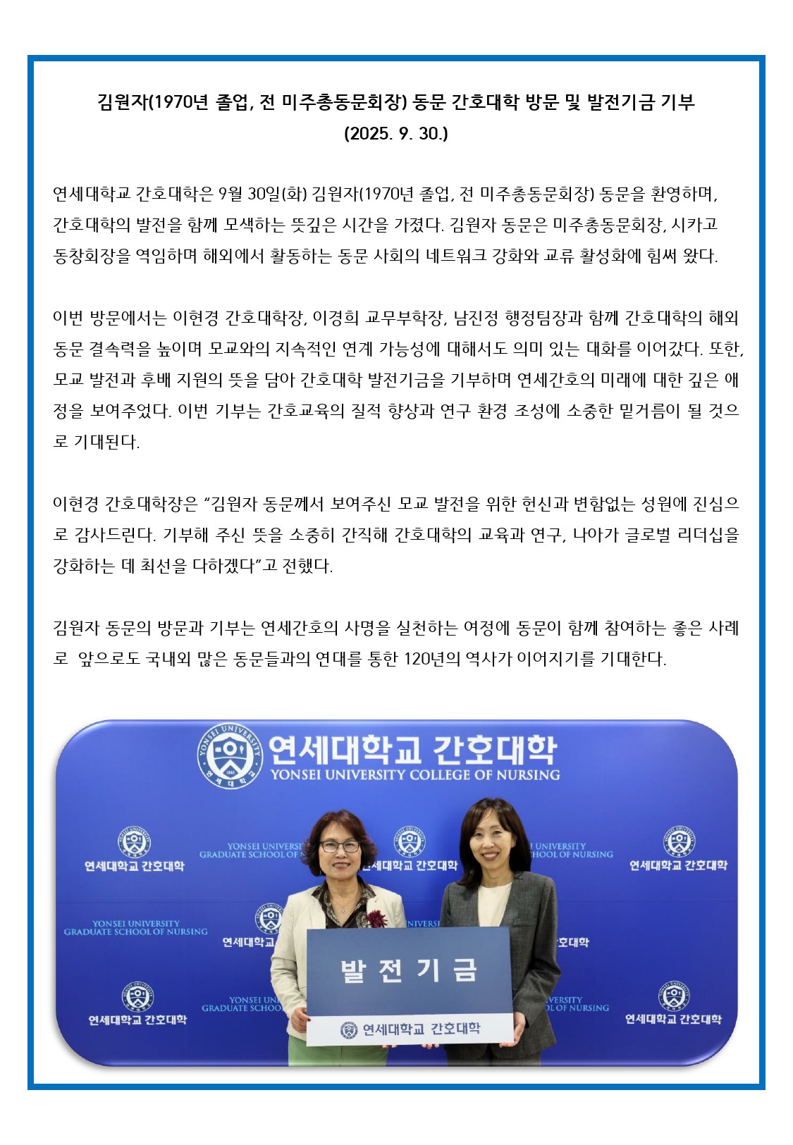 News 김원자(1970년 졸업, 전 미주총동문회장) 동문 간호대학 방문 및 발전기금 기부 [2025.09.30] 관리자 2025-10-01 조회수 504 공유하기 공유하기 페이스북 네이버블로그 카카오톡 카카오스토리 닫기 목록 이전글연세대학교 간호대학, 메풀 전산초 명예교수 기념 학술대회 개최 "차세대 간호과학자 양성: 혁신적 연구·교육·정책” 주제로 미래 발전 방향 모색" 다음글연세대학교 간호대학, 환자안전문화 연구 두각 - 메다파나뉴스